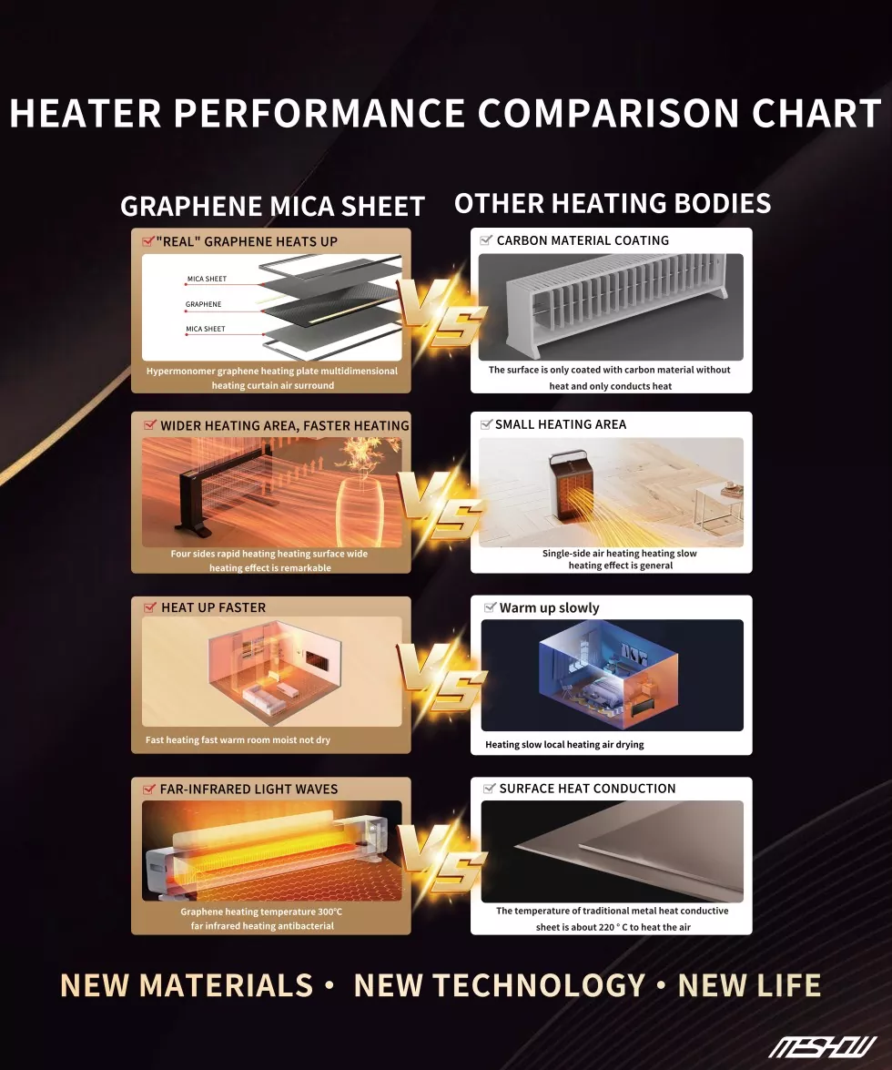 Meshow fördert hochwertige 1800-W-weiße Graphen-vertikale Heizungen in nationalen und internationalen Märkten. Mit der Graphen -Heizungstechnologie und einer hohen Effizienz und Energieeinsparung wird sie von Heim- und Bürokonsumenten sehr bevorzugt und ist die bevorzugte Heizgeräte geworden. Die Heizung besteht aus Graphenmaterial, das eine Hochgeschwindigkeitsumwandlung von elektrischer Energie in thermische Energie mit ultrahoher thermischer Leitfähigkeit erzielt, was zu einer schnellen und gleichmäßigen Erwärmung führt. Der effiziente Modus erzeugt hervorragende energiesparende Effekte, insbesondere für kalte Wintersaisonen und sorgt für kontinuierliche Wärme.